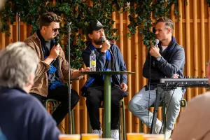 Oskar och Johann Bernövall tillsammans med Niklas Thor i samband med Supportrarnas försnack i Supporterbaren inför Sirius-GAIS förra säsongen.