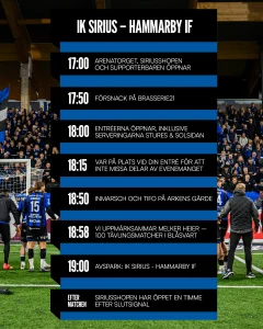 Välkommen till Studenternas och årets första allsvenska hemmamatch mellan IK Sirius och Hammarby IF. Här nedan hittar du all information du behöver inför matchen – från vad som händer på och runt omkring arenan till praktisk info som gör ditt besök så smidigt som möjligt.