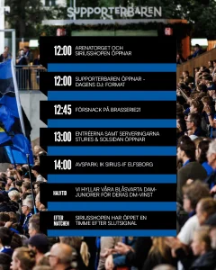 Redan 12:00 öppnar dörrarna till Supporterbaren där du kan ladda upp med musik, god mat, dryck och blåsvart supportergemenskap.